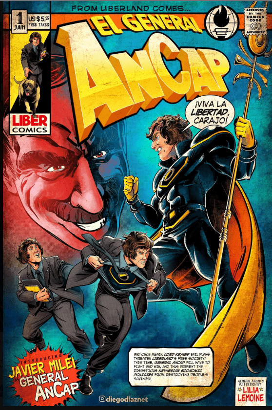 Hace seis años, decía que «el malvado Lord Keynes vuelve a amenazar la sociedad libre de la Patria. Esta vez el General AnCap tendrá que luchar y vencer, para impedir que la desastrosa economía keynesiana destruya los ahorros de la gente». En la parte superior de la página un enorme rostro del economista británico sonríe con expresión satánica frente al superhéroe libertario. Ojalá al gobierno todo le saliera tan bien como la historieta.