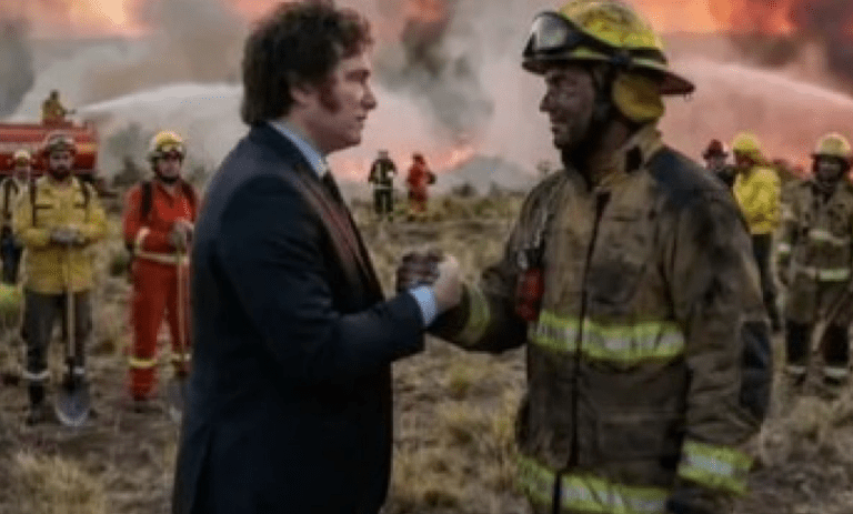Un problema del Presidente es que no tiene límites, ya que pasa sin dificultad de formas originales de publicidad a falsificaciones groseras. Una cosa está muy bien, la otra es una estafa escandalosa. Es lo que hizo con una foto, en la que aparece en los bosques quemados de Chubut, que ya superan la superficie de la Capital Federal. Vestido con saco y corbata, estrecha la mano de uno de los bomberos que está luchando contra el fuego. Se trata de una imagen creada con Inteligencia Artificial. La única relación con el escenario y la catástrofe es la drástica reducción del presupuesto asignado al Servicio Nacional del Manejo del Fuego y la subejecución sobre ese monto ya jibarizado. En 2024 el presupuesto casi triplicó el del año anterior, pero sólo se ejecutó un 7% de lo asignado. De ese modo, ajustado por inflación, representó una ejecución real 81% menor que en 2023. En 2025 aumentaron tanto el presupuesto como su ejecución, pese a lo cual el total real siguió por debajo de 2023. Casi 20.000 millones de pesos no fueron ejecutados. Este año la caída nominal es algo más de esos 20.000 millones (53% sobre 2025, que ajustados por inflación implican una reducción del 69% sobre 2023).