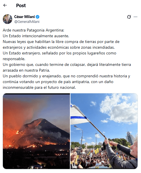 La quemazón de Chubut atrajo a otros especímenes. El ex jefe del Ejército entre 2013 y 2015, César Santos Gerardo del Corazón de Jesús Milani, publicó un correcto texto patriótico sobre la ausencia del Estado, pero dijo que era responsable del fuego «un Estado extranjero», y lo ilustró con una foto de Milei enarbolando la bandera de Israel, cuyo gobierno está cometiendo Crímenes de Lesa Humanidad en Gaza. Aun con mayor precisión pero no con mayor fundamento, una periodista de la radio Diez dijo que dos israelíes eran los causantes del fuego. Luego de ser desmentida, Marcela Feudale se disculpó, dijo que se había confundido y que no tenía ánimo discriminatorio.