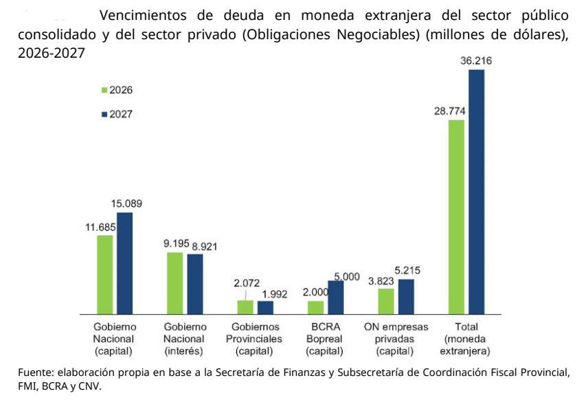 «El gráfico anterior exhibe los vencimientos de capital e interés en moneda extranjera del sector público nacional y provincial, del BCRA y las obligaciones negociables de las grandes empresas privadas. Se trata de una situación por demás crítica: el total de vencimientos asciende a 28.774 millones de dólares en 2026 y trepa a 36.216 millones en 2027. Difícilmente el excedente comercial que se achica pese a la expansión de las exportaciones energéticas pueda sostener esos niveles de vencimientos. No está demás decir que esto es absolutamente independiente del resultado fiscal».