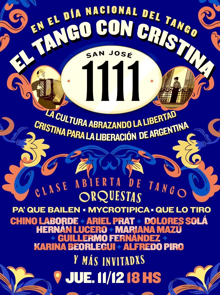 En el día nacional del Tango, se realizará este jueves 11 de diciembre a las 18 en la puerta del domicilio de Cristina Kirchner (San José 1111), el festival “El tango con Cristina” que reunirá a orquestas, músicos y bailarines que convocan por la libertad de la ex presidenta.