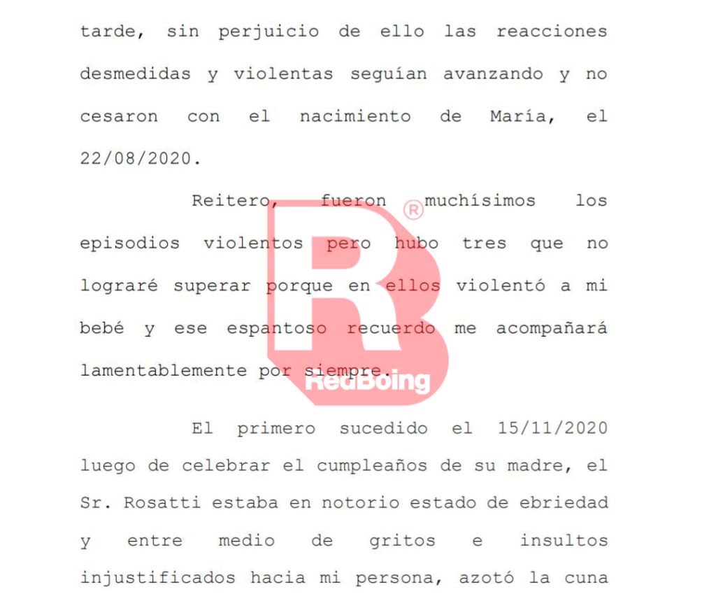 Otra de las situaciones que revela la demanda judicial es la violencia ejercida contra su pareja y su hija pequeña. Al ser descubierto en una situación aparentemente de infidelidad, el demandado sacó de la cuna a su hija y la tiró contra la cama matrimonial. “Esa noche fue el punto final de mi tolerancia”, señaló la denunciante. Pero en lugar de irse, Rosatti le gritaba a su esposa que llame al 911, porque la “iba a matar”, siempre según el relato de la denunciante a la justicia. Al día siguiente y en presencia de la mujer que trabajaba como niñera para la familia, el denunciado accedió a irse del hogar.