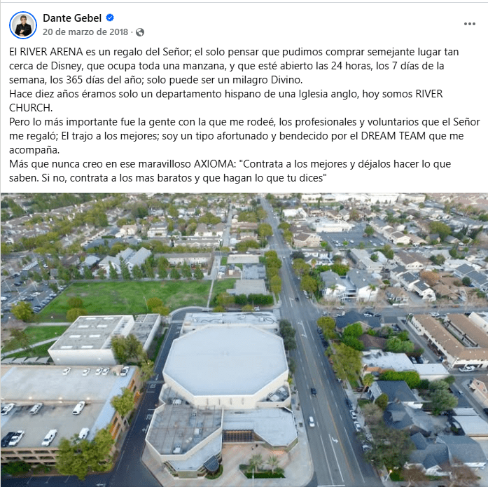 El pastor Gebel logró gran popularidad hace más de 30 años, al llenar los estadios de Vélez Sarsfield y River Plate con encuentros masivos denominados Superclásicos de la Juventud. También comenzó predicando en televisión, de 1 a 2 de la madrugada. El año pasado su programa La Divina Noche de Dante, pasó a horario central en el Canal 13 del Grupo Clarín, asociado con Mario Pergolini, el introductor de los insultos en la radio y la televisión argentinas, precursor de Jorge Lanata y de Javier Milei. En 2019, Gebel anunció que Netflix produciría una serie con su biografía, cosa que hasta ahora no se ha confirmado. En Los Ángeles tiene su propia congregación, la River Church, en Anaheim, que es un referente para la comunidad hispana. Showman e influencer recibió en Miami el Martín Fierro al mejor presentador de la televisión.