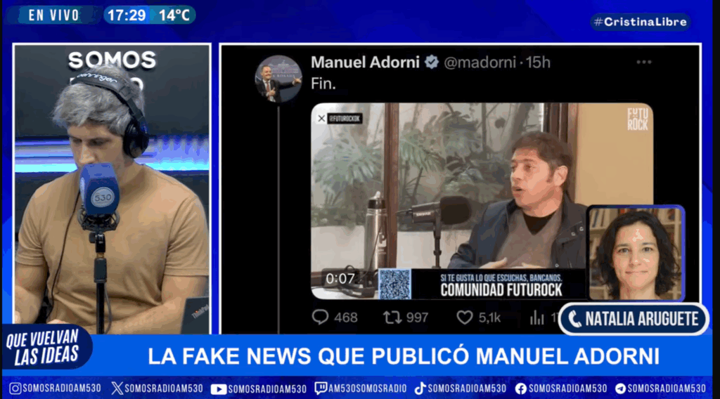 En diálogo con Pablo Caruso y equipo en Que Vuelvan Las Ideas (AM 530 – Somos Radio, lunes a viernes de 16 a 18) la investigadora y especialista en Redes Sociales se refirió a la divulgación de noticias falsas por parte del gobierno nacional, a raíz de la fake news sobre Axel Kicillof que fue compartida por el presidente libertario y su vocero presidencial.