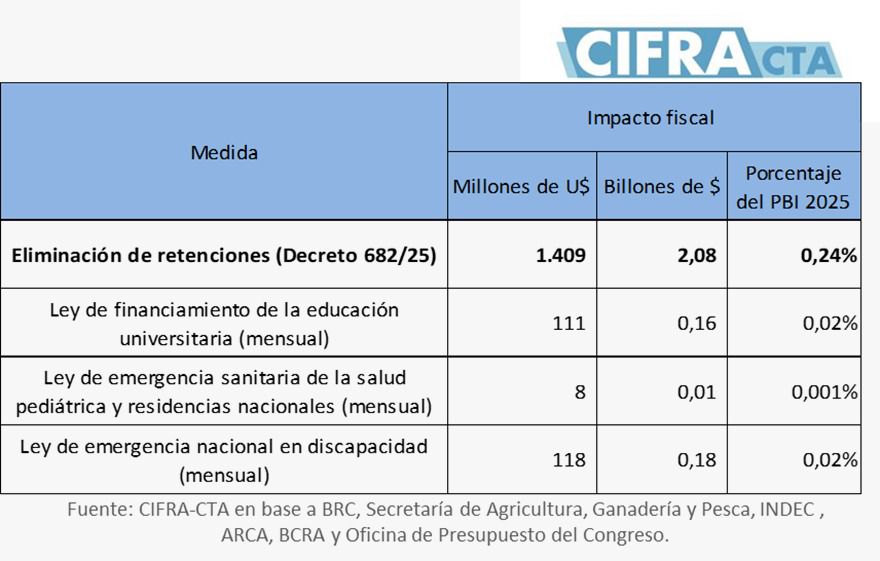En este marco, Quintero destacó los datos del Centro de Investigación y Formación (CIFRA-CTA) sobre el impacto fiscal que tiene la quita de retenciones al denominado “campo” comparado con lo que se necesitaría para el financiamiento de la educación universitaria, la emergencia pediátrica y de discapacidad.