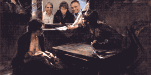 Ernesto de la Cárcova pintó Sin pan y sin trabajo en 1894. Es el reflejo artístico de la crisis que acabó con el gobierno del cuñadísimo, Miguel Juárez Celman, y puso al borde de la quiebra a la banca inglesa de los hermanos Baring, cuando su principal deudor dejó de pagar la vertiginosa deuda contraída por Rivadavia. Un pool de bancos se reunió para rescatar a la banca Baring y el Vicepresidente Carlos Pellegrini se hizo cargo del gobierno, con políticas drásticas para evitar el default. Pasó a la historia como el precursor de la industria, pero su gobierno practicó un fuerte ajuste, recesivo, con caída de salarios y el costo social que vio De la Cárcova. La creación de la Unión Industrial, en 1891, señaló el camino de salida. La intervención de Navaja en esa tela da un salto hacia delante de trece décadas, donde también se destaca la rigidez del ajuste, pero no se avizora una salida productiva, salvo en escasos rubros, que no son los que crean empleo: intermediación financiera, agropecuaria, minera e hidrocarburífera. Son los únicos en que creció la industria en la última medición del INDEC, mientras siguen desapareciendo empresas y puestos de trabajo en todos los demás. Al gobierno, según parece, no le preocupa. Por la ventana del cuadro se ven chimeneas encendidas en un paisaje urbano, que era la meta de Pellegrini. En la intervención de Navaja aparecen sonrientes Javier Milei, el Ministro de Economía Luis Caputo y el jefe de gabinete, Manuel Adorni.